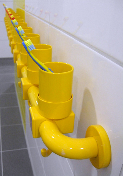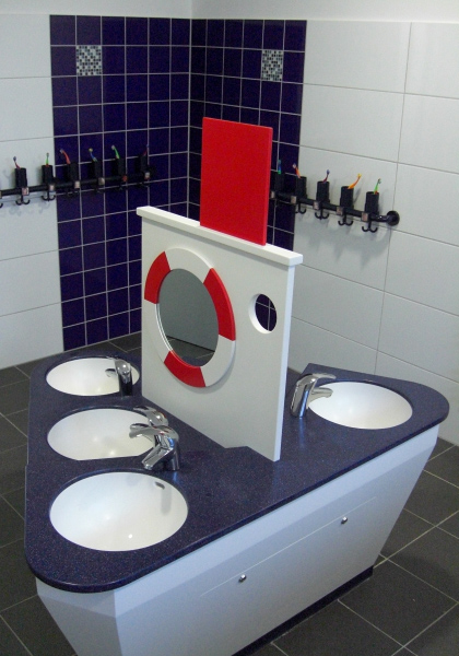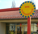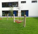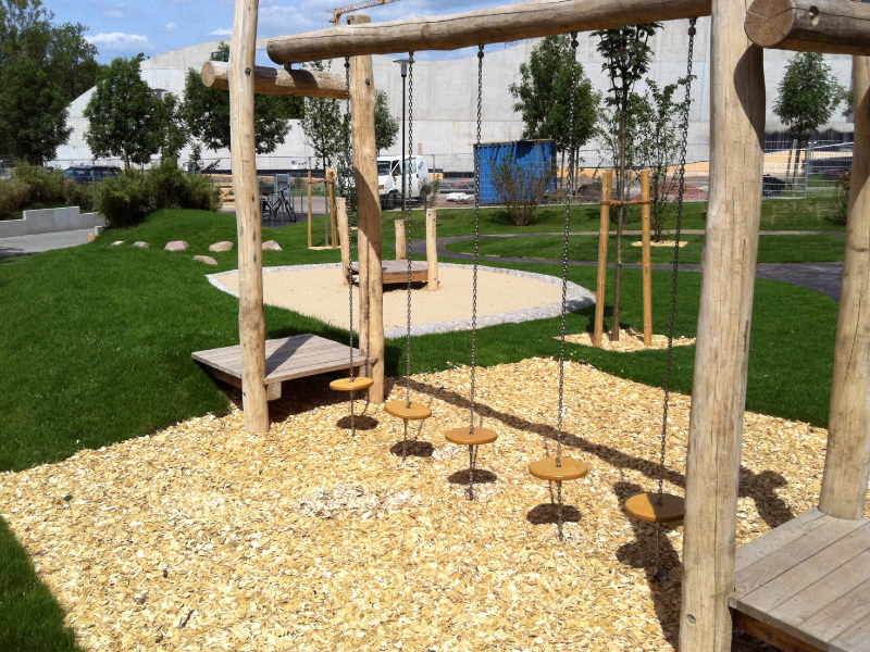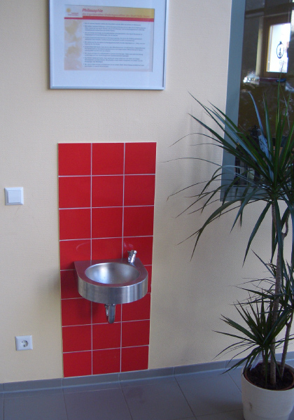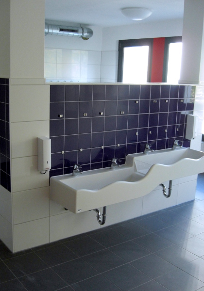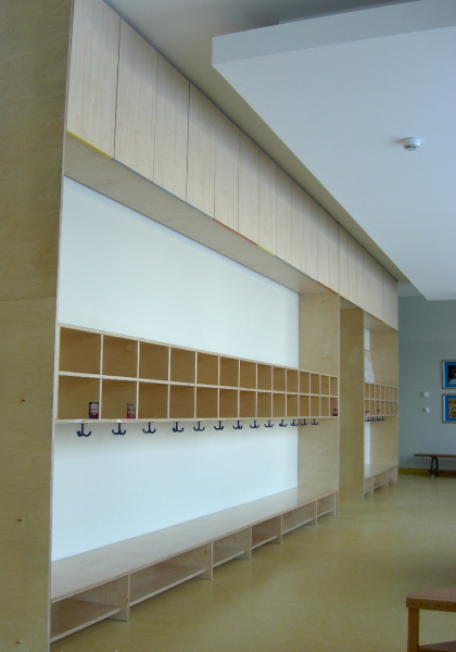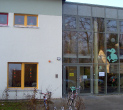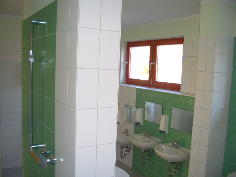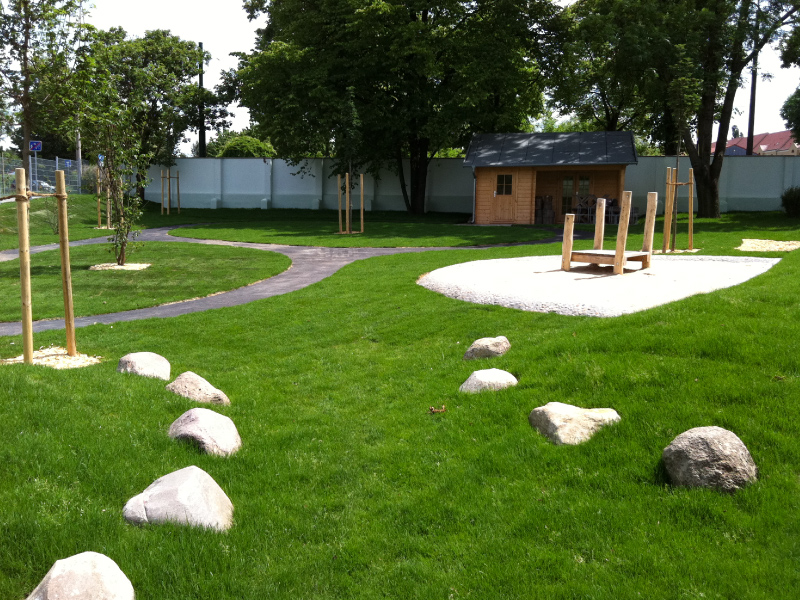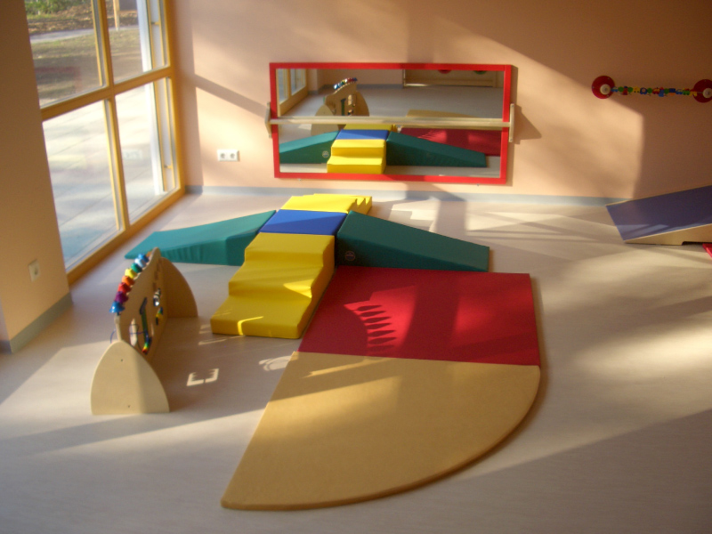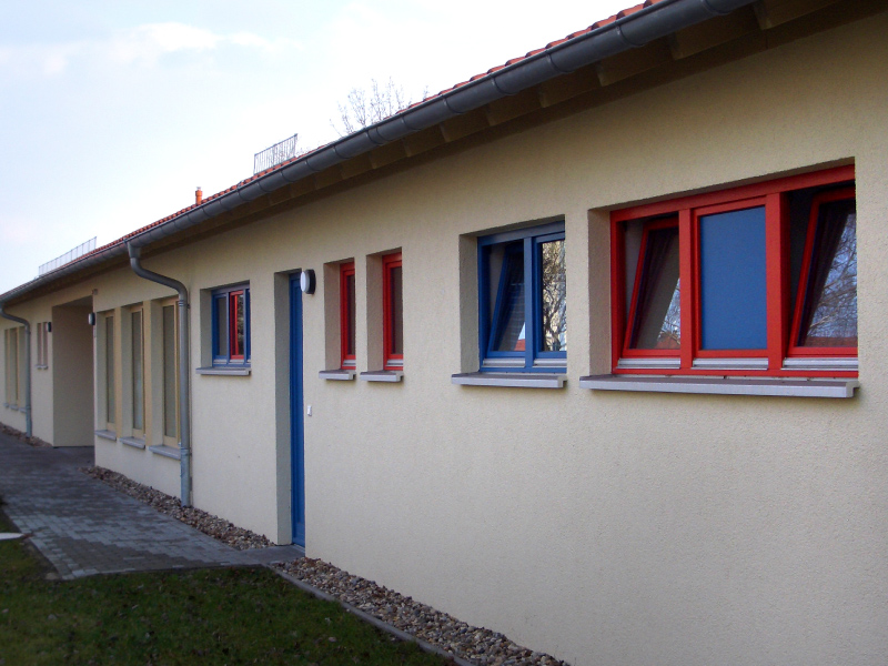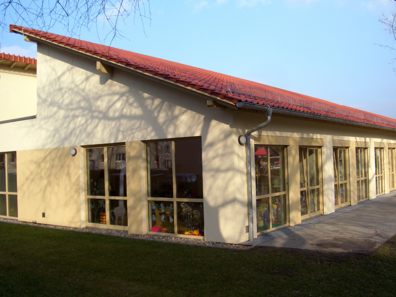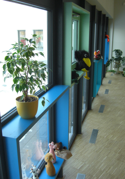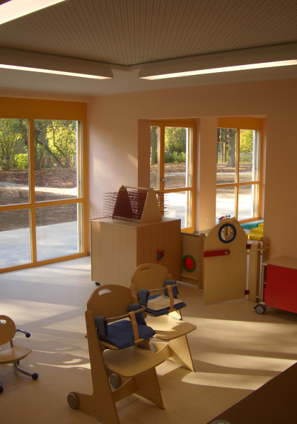 Es entstand ein eingeschossiger Baukörper, der sich sehr gut in die Umgebung einfügt. Die Gruppenräume sind mit Fußbodenheizung und raumhohen Fensterelementen ausgestattet. Alle Böden sind mit dem Naturprodukt Linoleum inklusive Korkmentschicht ausgelegt.
