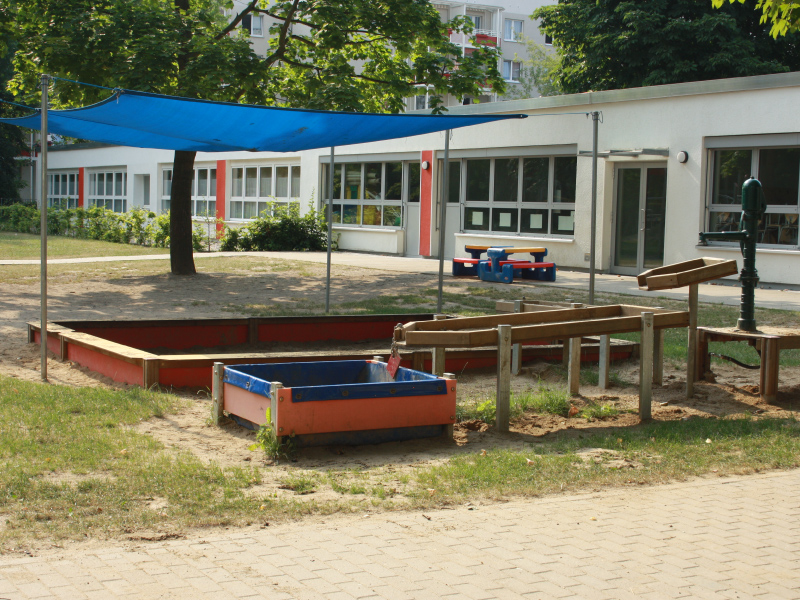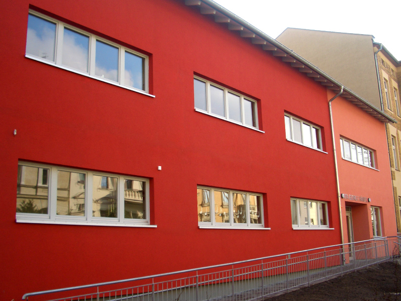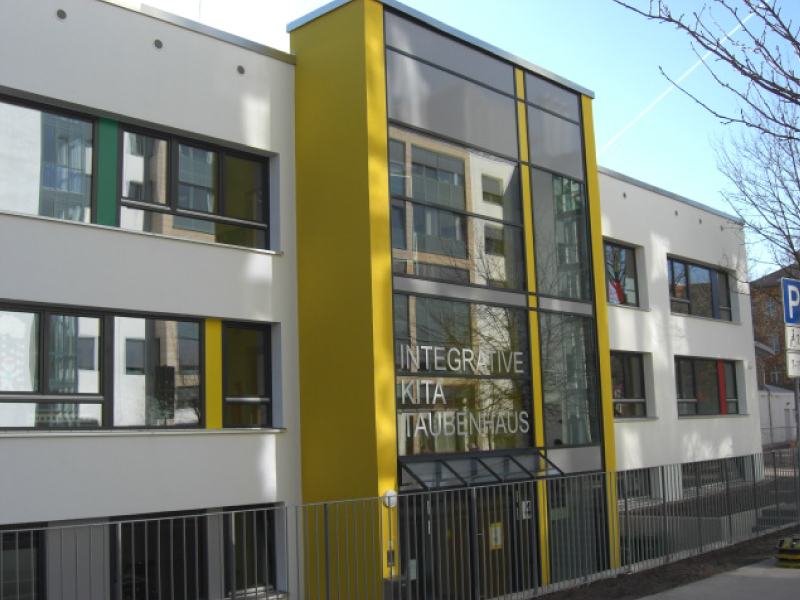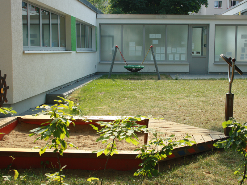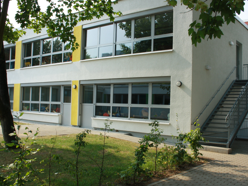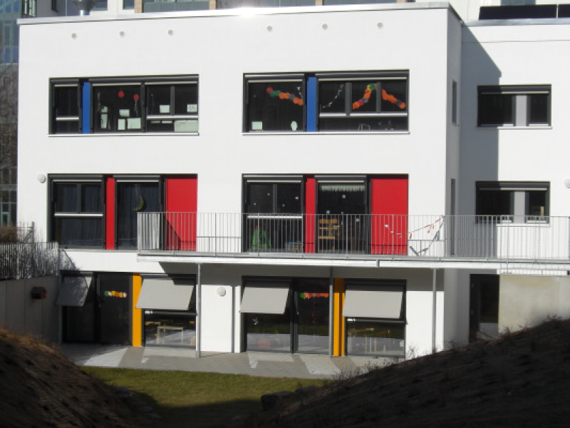 Die Kita wurde zwischen Gründerzeithäusern dreigeschossig mit Satteldach architektonisch anspruchsvoll errichtet. Die Naßbereiche wurden modern und mit neuester Technik gestaltet. Das in den Garten gebaute Speiserestaurant wurde mit einer großzügigen Dachterrasse gekrönt.