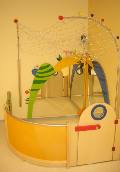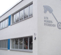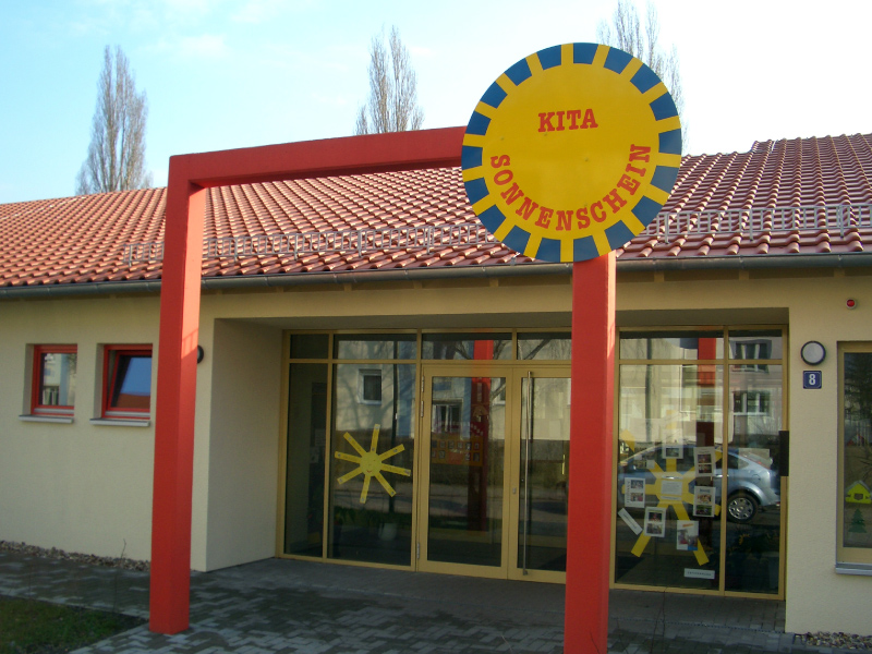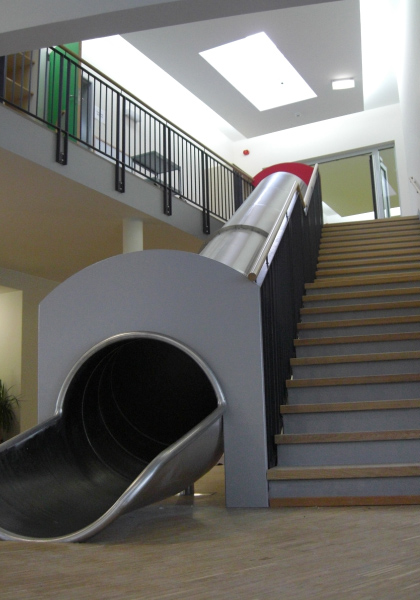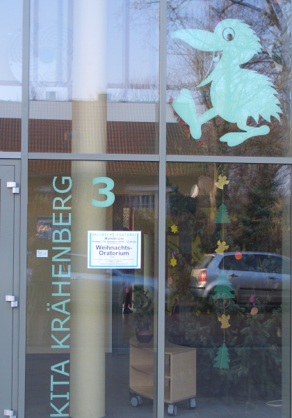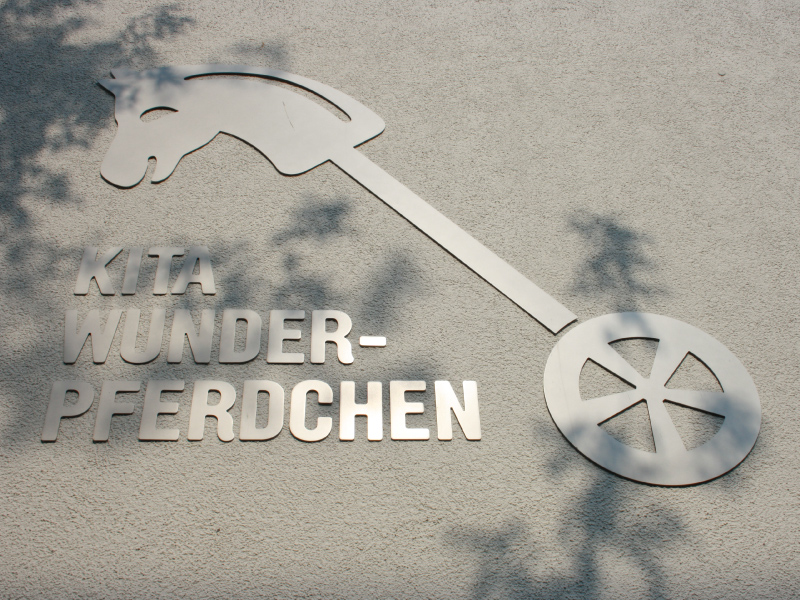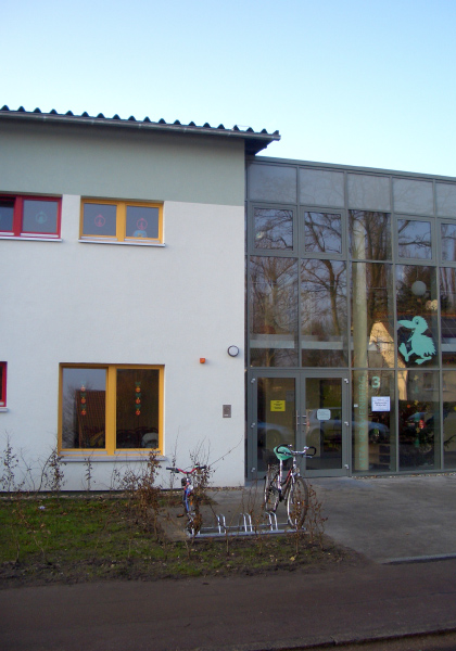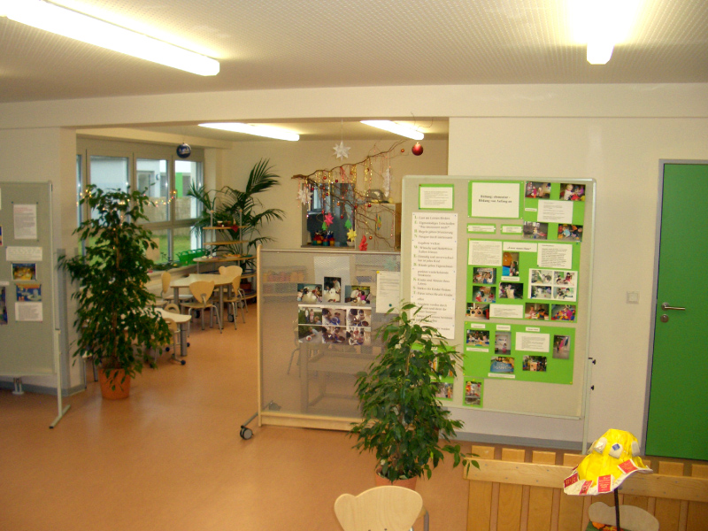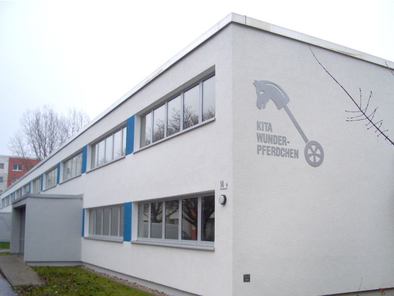 Der zweigeschossige Baukörper lädt mit einem gebäudehoch verglastem Foyer ein. Die Gruppenräume zum Garten angeordnet, wurden mit großen Fensterlementen und Fenstertischen ausgestattet. Über zweiflüglige Türen können Gruppenräume zu großgeräumigen Spielflächen vereinigt werden.